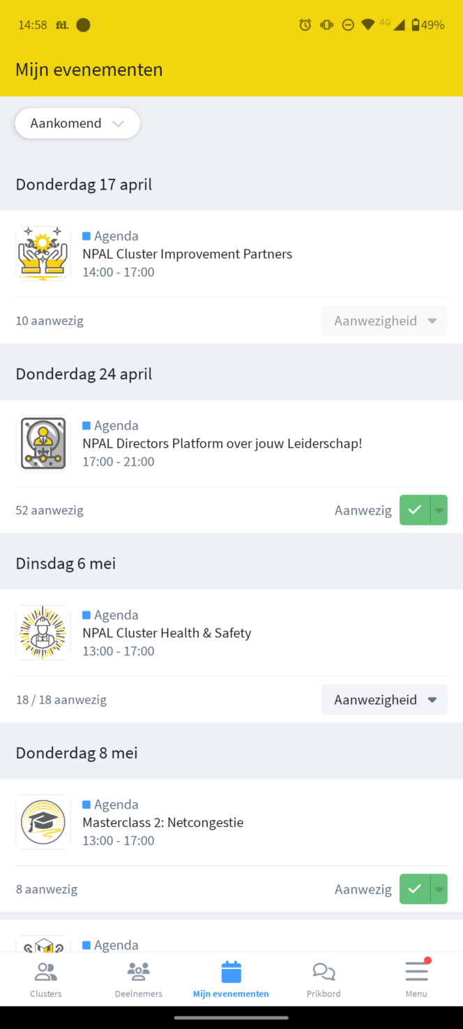 In de evenementenlijst vind je alle bijeenkomsten en je kunt eenvoudig jouw aanwezigheid doorgeven.